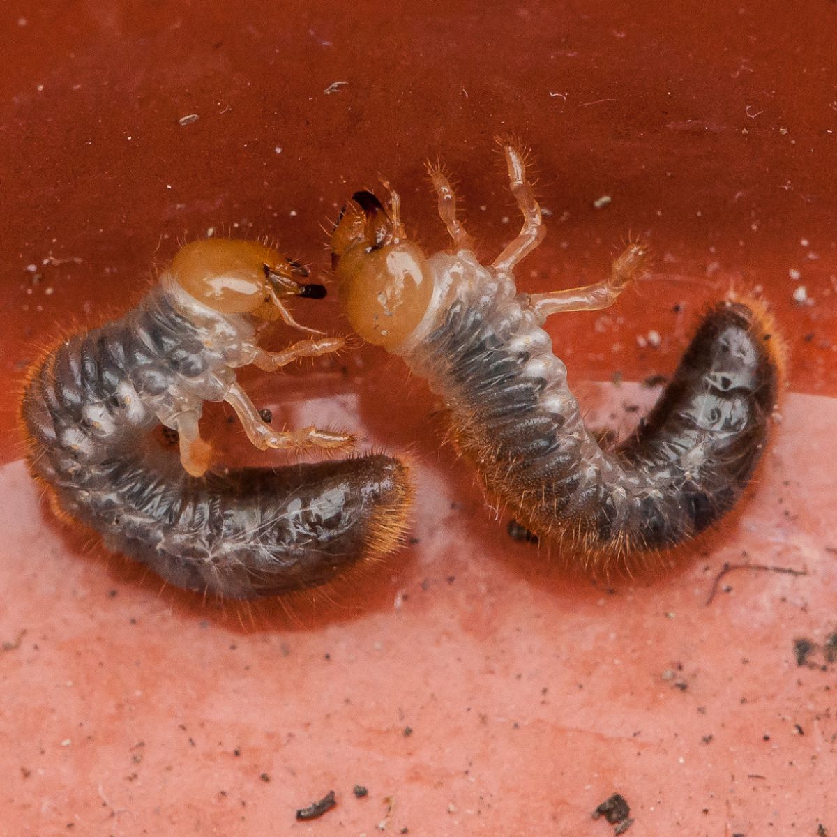 Deze beestjes vond ik vandaag, 31 oktober, in de grond van een bloempot die ik wilde opbergen. Ik vond er drie, stijf opgerold, met de pootjes gespreid. Een grappig gezicht. Ze zaten aardig diep in de grond, waarschijnlijk klaar om te overwinteren. Heel geleidelijk 'ontdooiden' ze wat duidelijk moei...