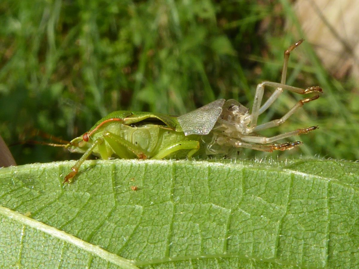 Vanmiddag aan getroffen in de duinen bij Wassenaar (Meijendel) op brandnetel. Volgens mij is er bij het uitsluipen iets fout gegaan, met name bij de linkervleugel. Overigens liep de groene schildwants gewoon over het blad en sleepte het vervellingshuidje met zich mee.