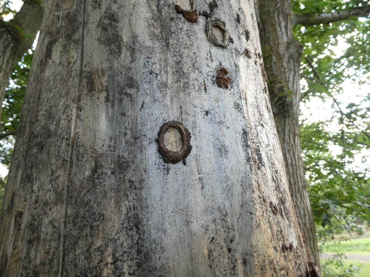 Op vakantie in Belgie, Viroin, eind juni zagen we vreemde ringetjes op een dode boomstam. Ze zijn verschillend van grootte en zaten ook onde een los stukje schors. Ik vroeg me af welk insect dit maakt?Groetjes,Francien