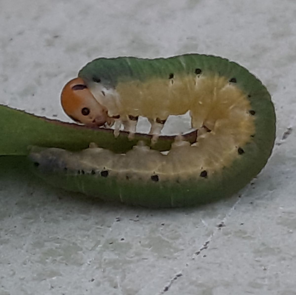 Vond dit rupsje tijdens het wegknippen van de uitgebloeide pioenrozen, even veilig gesteld en een foto gemaakt.Heb echter geen idee van de naam.Groet, Irma