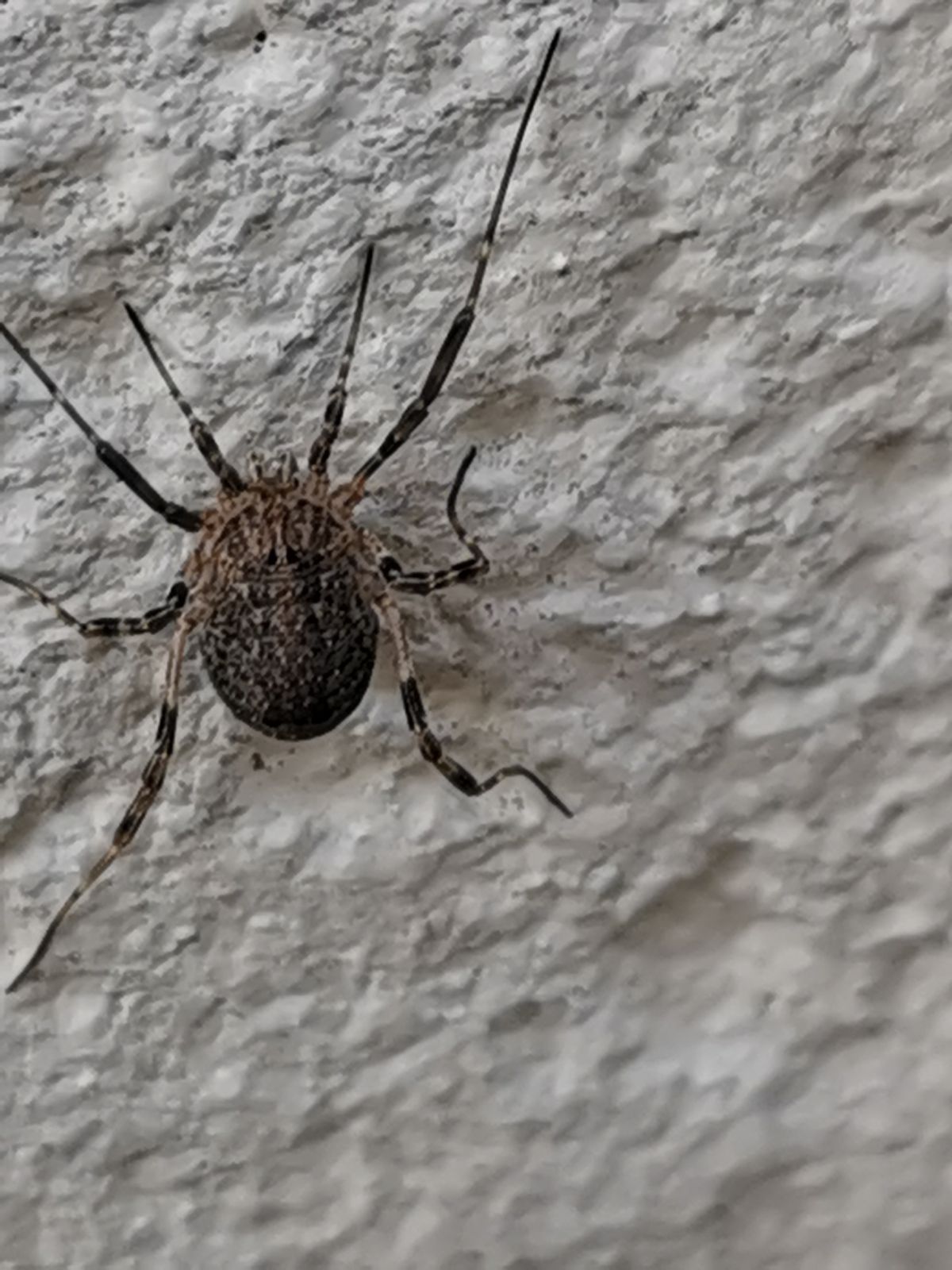 Op de muur thuis hoogezand Lichaam ongeveer 8 mm lang loopt niet echt hoog op zijn poten beetje een vreemde spin
