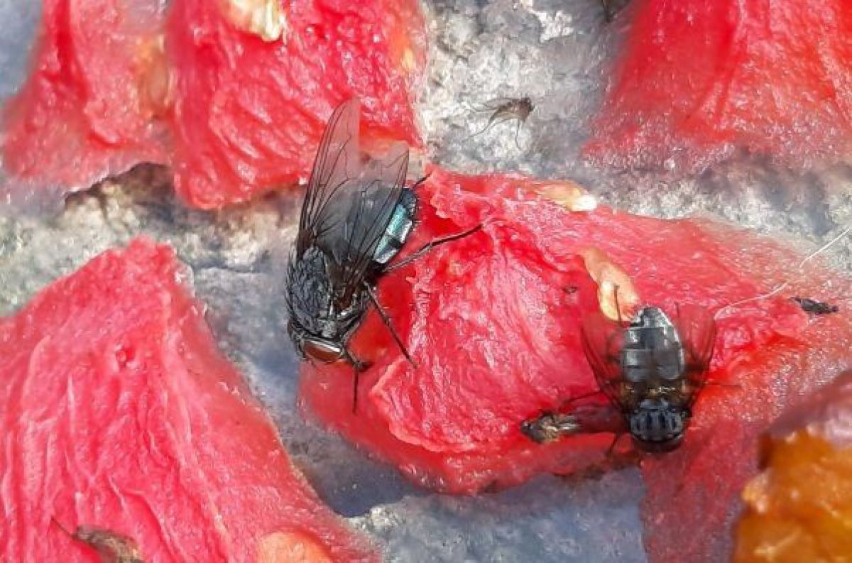 Op een bord met fruit zat deze grote vlieg met een opvallend blauw achterwerk, een bromvlieg denk ik. De roodwangbromvlieg ?