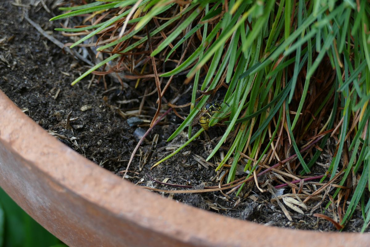 Al een aantal dagen zie ik circa 5 wespen af en aan vliegen naar het Engelse gras dat in een pot op mijn balkon staat. Ze vliegen er in, lopen heen en weer, lijken wat te verzamelen (eten?) maar ik zie ze niet wegvliegen met voedsel. Of zijn ze daar bezig een nest te maken? Ik heb er ook een filmpje...