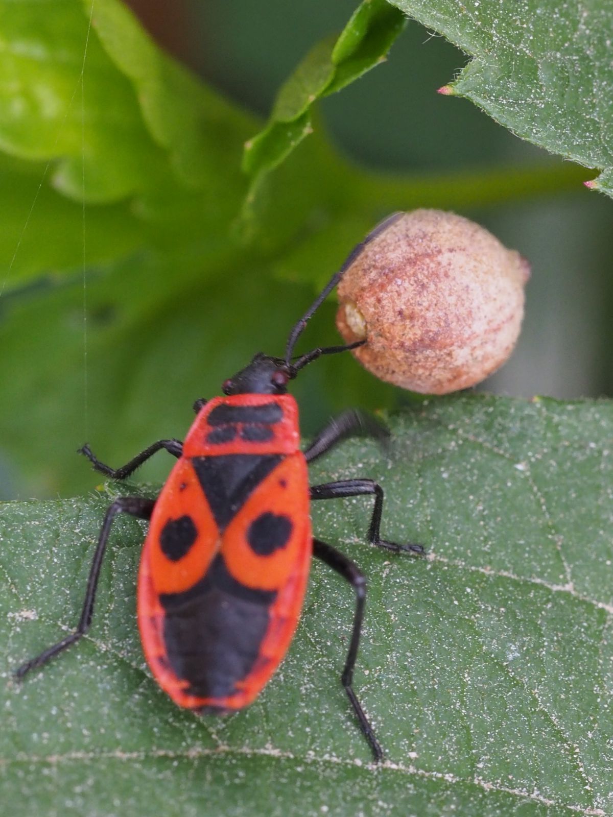 Vanmorgen zag ik deze vuurwants heel behendig dit balletje meevoeren, wat zou het kunnen zijn? Nest van een spin, anders.