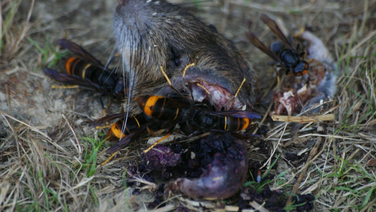Gezien ,zwart oranje wespen? In Frankrijk Ongeveer vier cm groot Die een dode muis op atenwie weet hoe deze heten , ik kan ze niet vinden op internetvr groet lennie