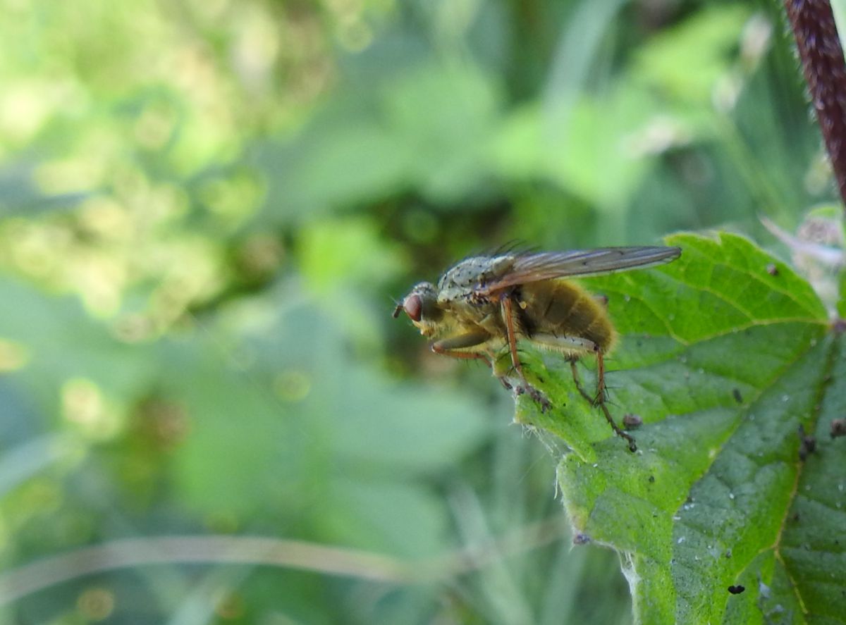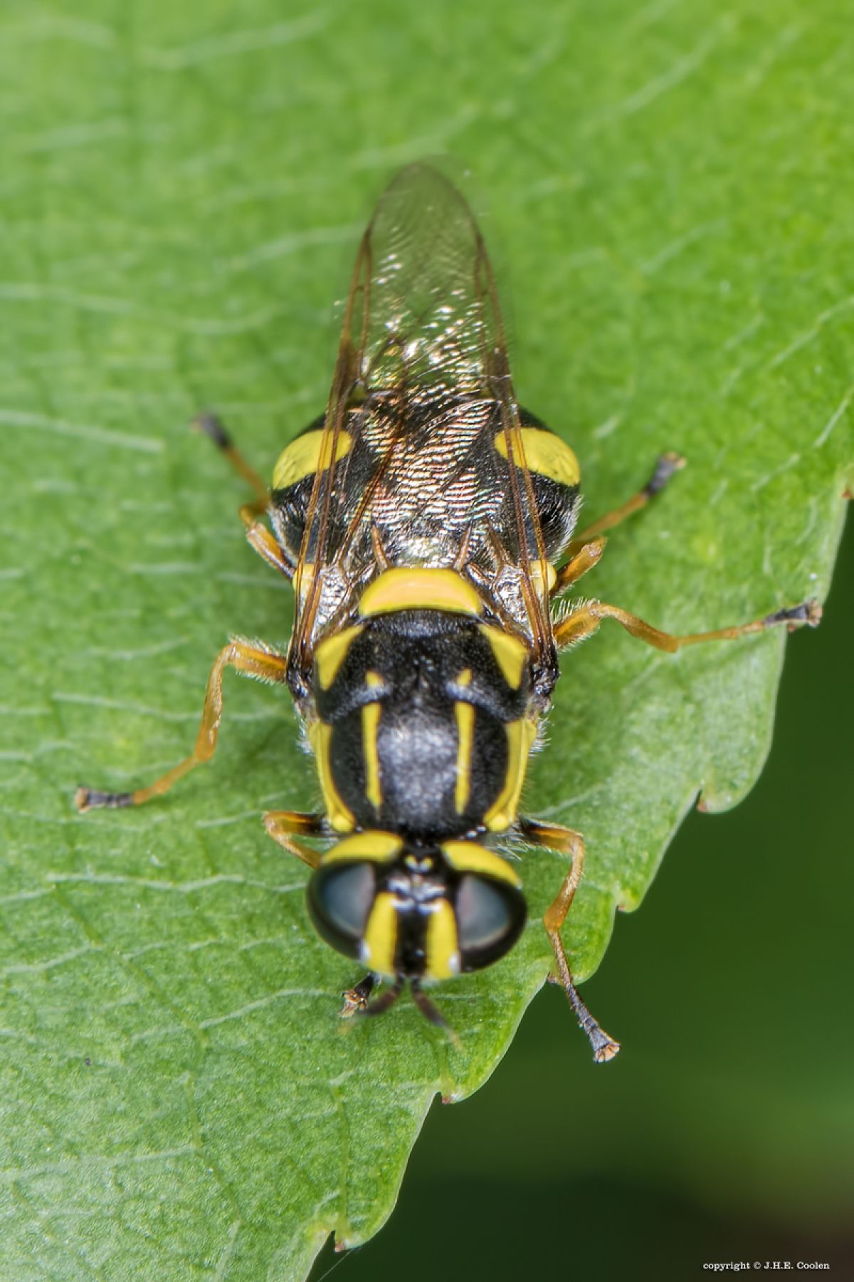 deze kleine bewegelijke vlieg gespot, door het geel viel hij op, ongeveer 1 cm groot, Raamdal, bij het water onder de bomen, dacht aan een fobzweefvlieg, maar daar staat deze niet bij, dus wat wel. Gr. Jan