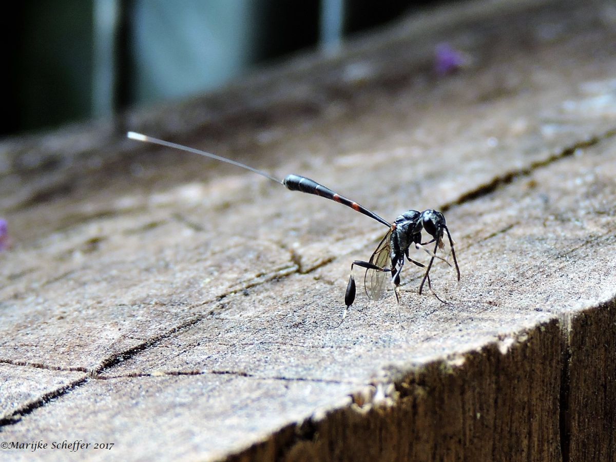 Welke "sluipwesp" zit in mijn tuin, bij het zitje is ie op zoek in gaatjes van een oud stuk hout tot ook in de houten meubels worden onderzocht.Gasteruption assectator deze naam heb ik gevonden maar verder kom ik niet.vr. groet Marijke