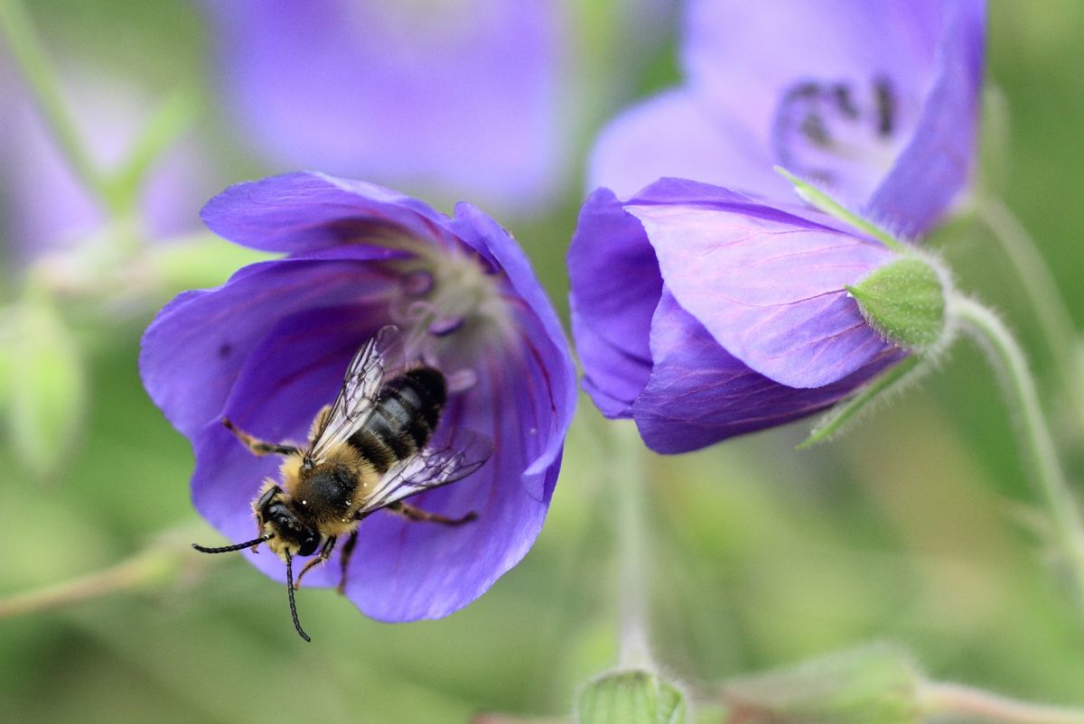 Dit kleine bijtje (plm. 1.5 cm lang) komt graag in de bloemetjes van de geraniums en zit daarin soms wel een minuut heel stil, in plaats van ijverig nectar en stuifmeel te verzamelen. Vraag 1. hoe heet deze bij? Vraag 2. Waarom houdt het beestje pauzes tijdens het werk.