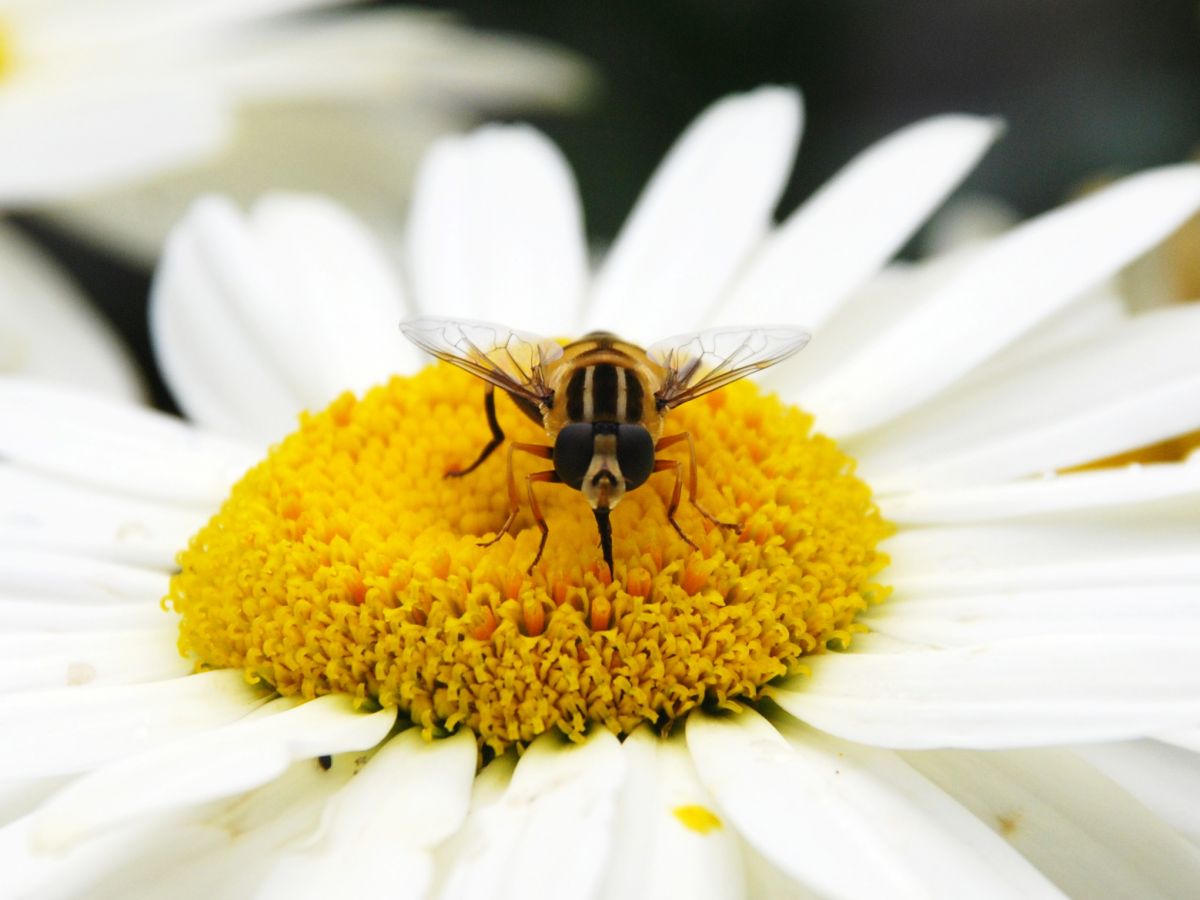 Vanmiddag bij ons op de gele margrieten. Op elke bloem zo'n bij, ter grootte van een wesp.