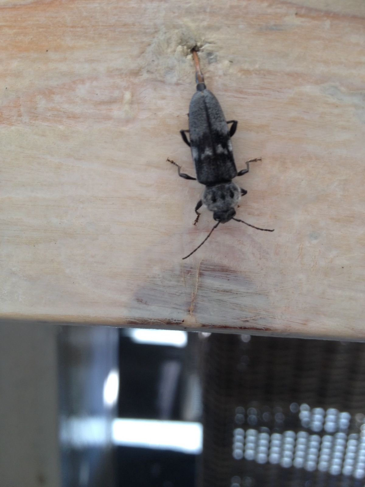 Deze kever kwam aan vliegen en ging met zijn of haar achterlijf de spleetjes van de tafel afvoelen. Ik zag een vloeistof lopen toen zij/ hij een gaatje gevonden had.
