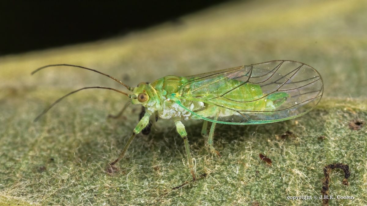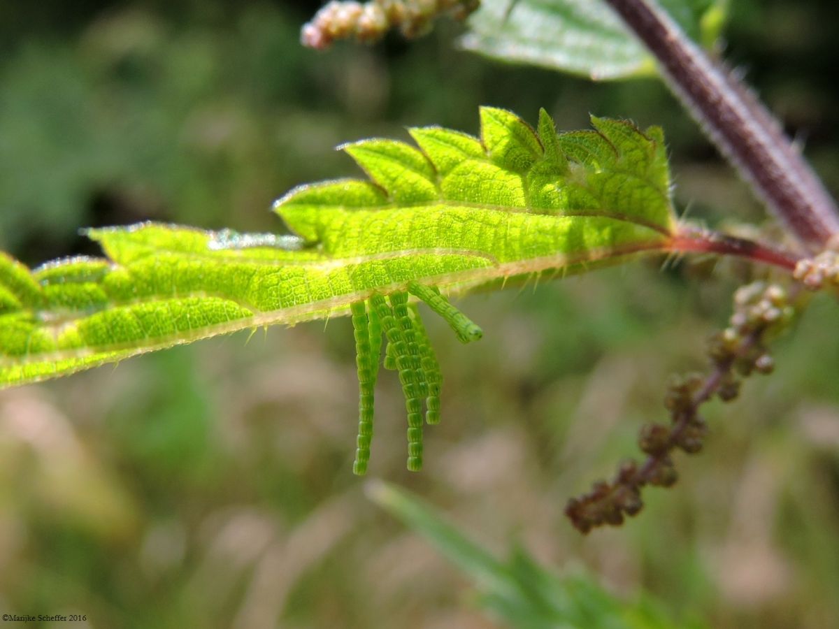 Aan de onderkant van een brandnetelblad, aan de rand van een weiland (dit word niet gemaaid) hangen een paar prachtig strengetjes ?????