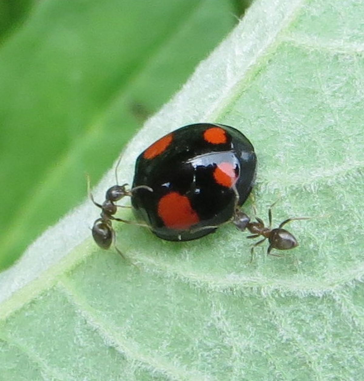 Dit Lieveheersbeestje leefde en verplaatste zich. Twee mieren waren ondertussen met hem bezig... Heeft iemand een idee wat hier gebeurt?