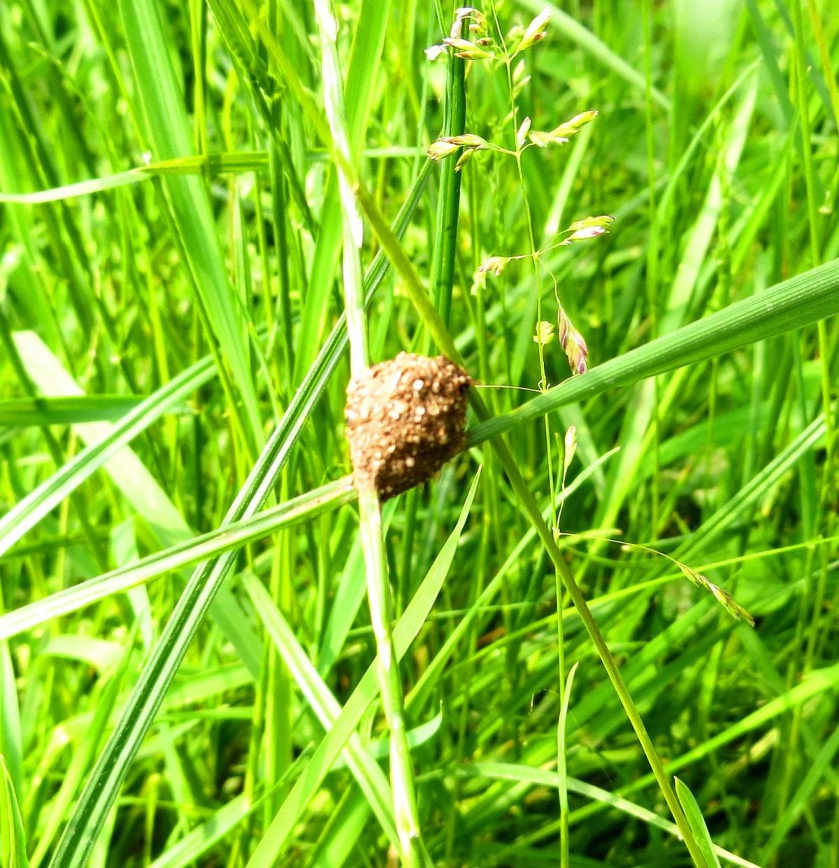 Vandaag op de Groote Heide in Venlo deze coconachtige prop, het lijkt wel een modderklont en hin vast tussen 2 stevige grassprieten.