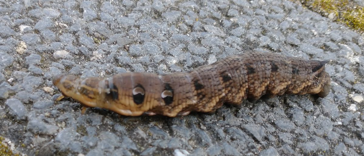 Vanmorgen kwam ik dit tegen. Beetje op internet gekeken en het lijkt een Teunisbloempijlstaartrups. Volgens Wikipedia sinds in Limburg, maar vaker zuidelijker.