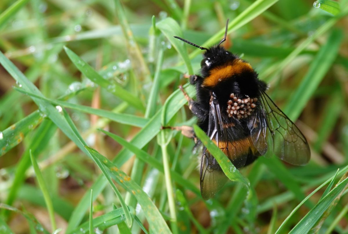 Dag forum,is dit een aard hommel?En wat zit er op zijn rug, zijn dat misschien allemaal teken?Het was een grote hommel, wel 3 cm. in de lengte.Vandaag [ 20-08-2021 ] gefotografeerd bij de Fraeylemaborg in Slochteren.Vrgr. Anna.