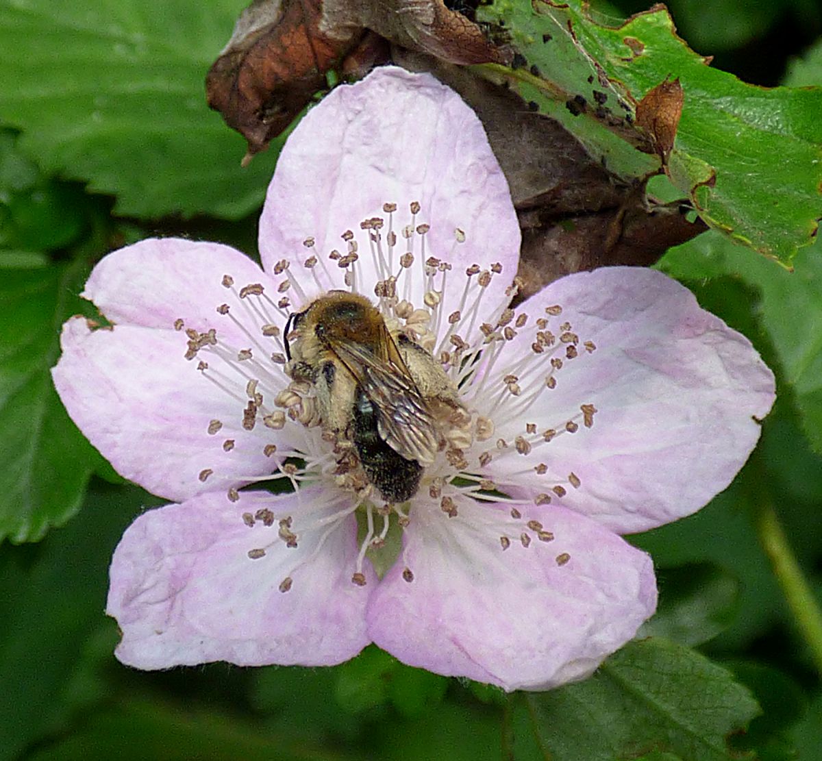 Ook niet echt duidelijk helaas.Het lijkt erop dat deze bij hele wollige poten heeft.Op een braambloem.