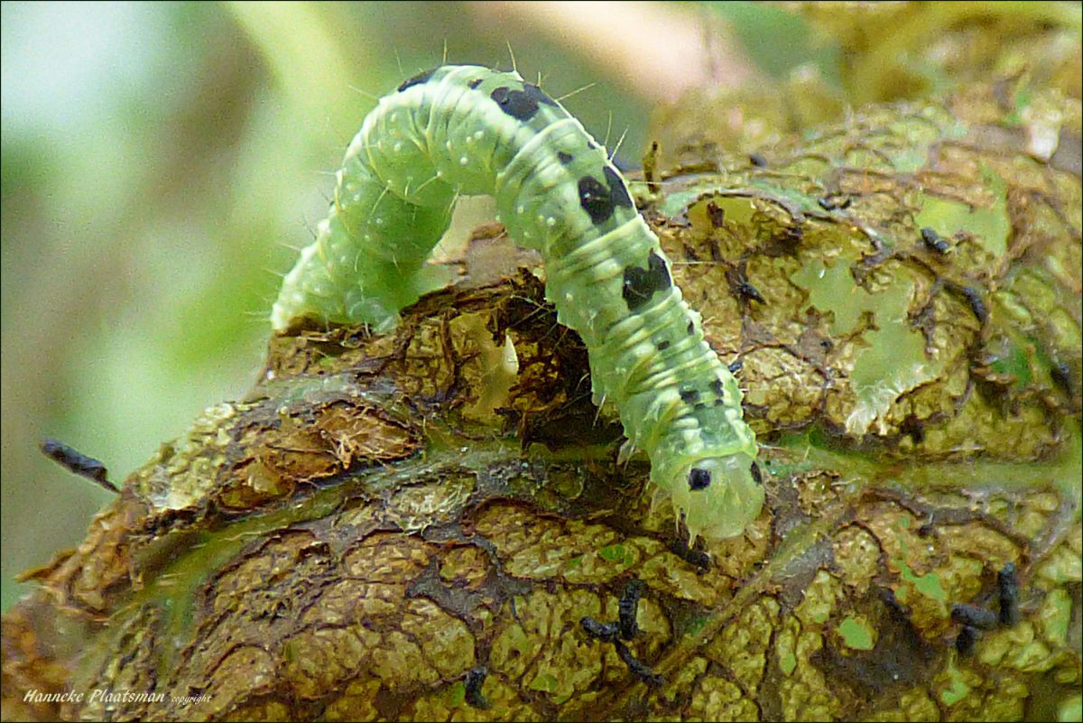 Nog een vraagje voor Jeanette,Op de bladeren van de els die al helemaal aangevreten waren door de larven van de elzenhaantjes, zat ook dit lichtgroene rupsje. Ik kan hem niet vinden, wel die lichtgroene lengte strepen, maar niet die zwarte stipjes erbij!