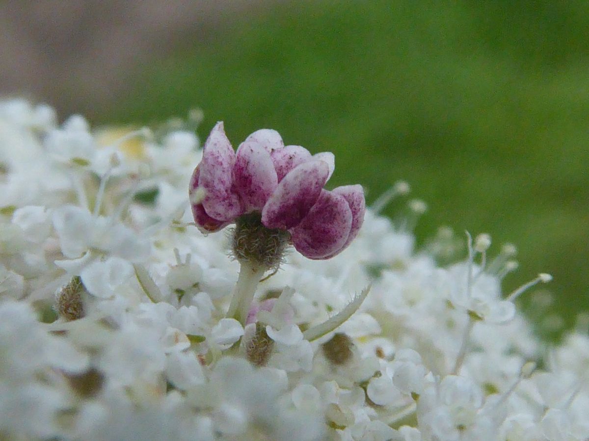Vanmiddag gezien in Zoetermeer in het Balijbos langs fietspad waar in de berm o.a. veel wilde peen staat. Ik dacht in het centrum van de "bloem" een insect te zien, maar toen ik met de loep keek, bleek het wen onderdeel van de plant te zijn.Aanvakelijk wit/rose, later donkerpaars.