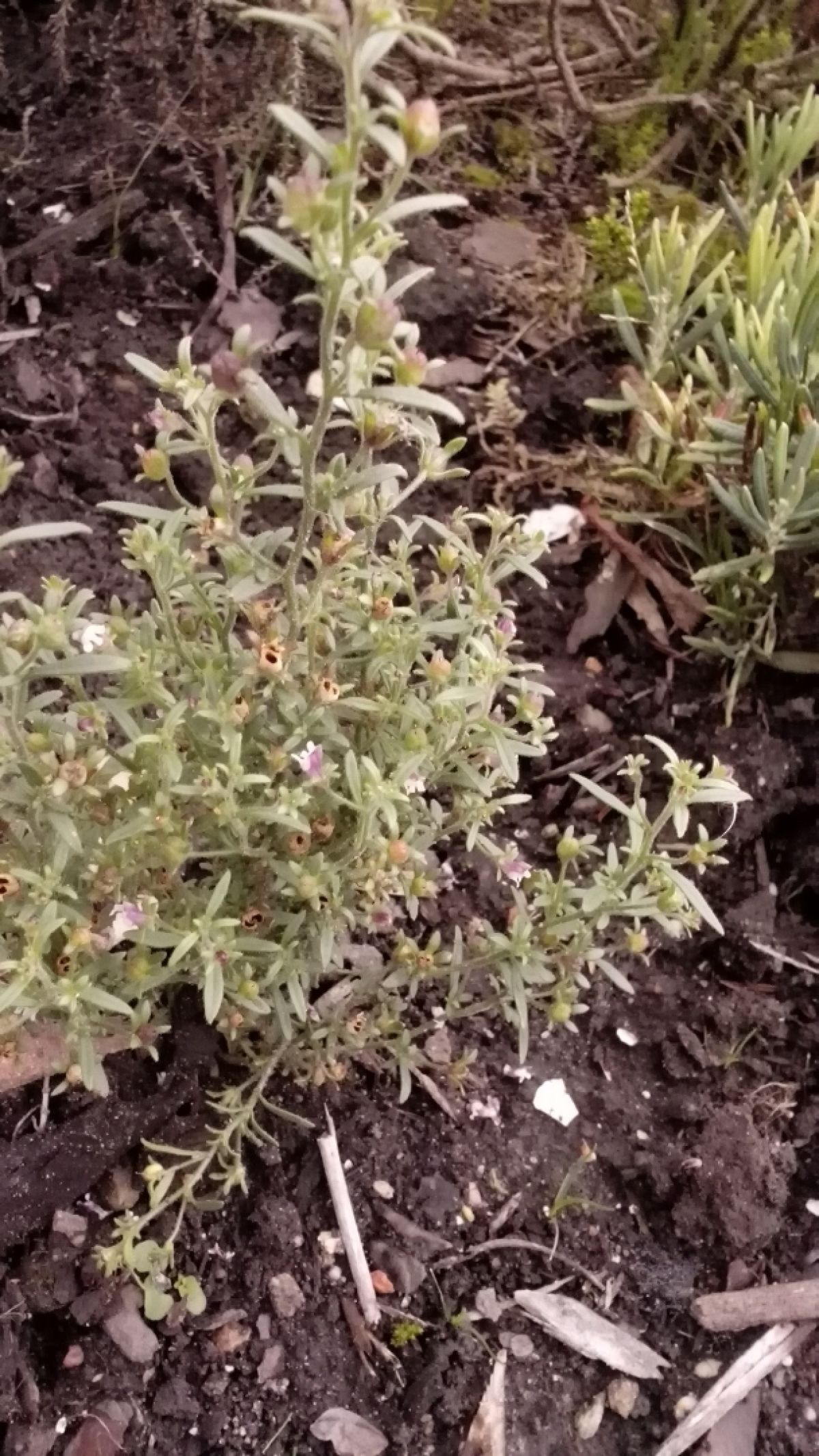 In mijn tuin in Wervershoof groeit al een tijdje dit bloemetje in de heidetuin. Lijkt een beetje op rozemarijnheide maar blaadje is kleiner en heel zacht. Lipbloemig zo te zien. Is "onkruid" maar ik heb hem laten staan omdat het zo mooi is. Weet iemand de naam?