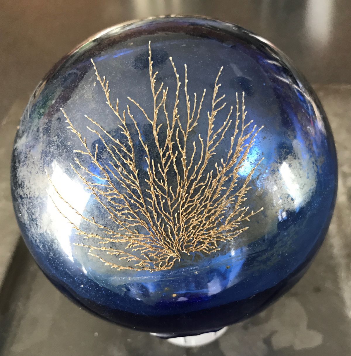 In de vijver hebben we een paar van deze glazen ballen drijven. Bij het schoonmaken en ik de bal uit de vijver haalde zag ik nog net op tijd deze prachtige algen versiering..... welke alg en is het een alg ?De bal heeft een doorsnede van ongeveer 12-13 cm