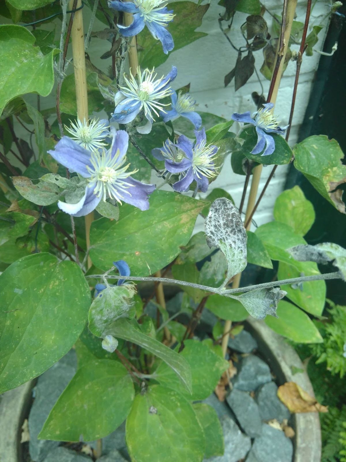 Wat mankeert mijn Clematis? Meeldauw of toch iets anders? De bladeren hebben soms een witte waas en worden daarna geler en droger.
