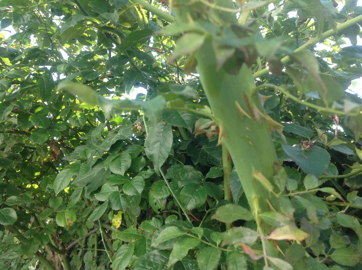 In mijn tuin staat een ongeveer vijftien jarige roos ..Ik zie nu dat er een ongeveer twee meter hoge tak die niet rond is zoals de andere takken ,maar plat is Hij is ongeveer 9 cm breed en 1 cm dik.Er zitten wel gewone ( flinke) dorens aan .Ik hoop dat het mij lukt om de foto mee te sturenik woon in...