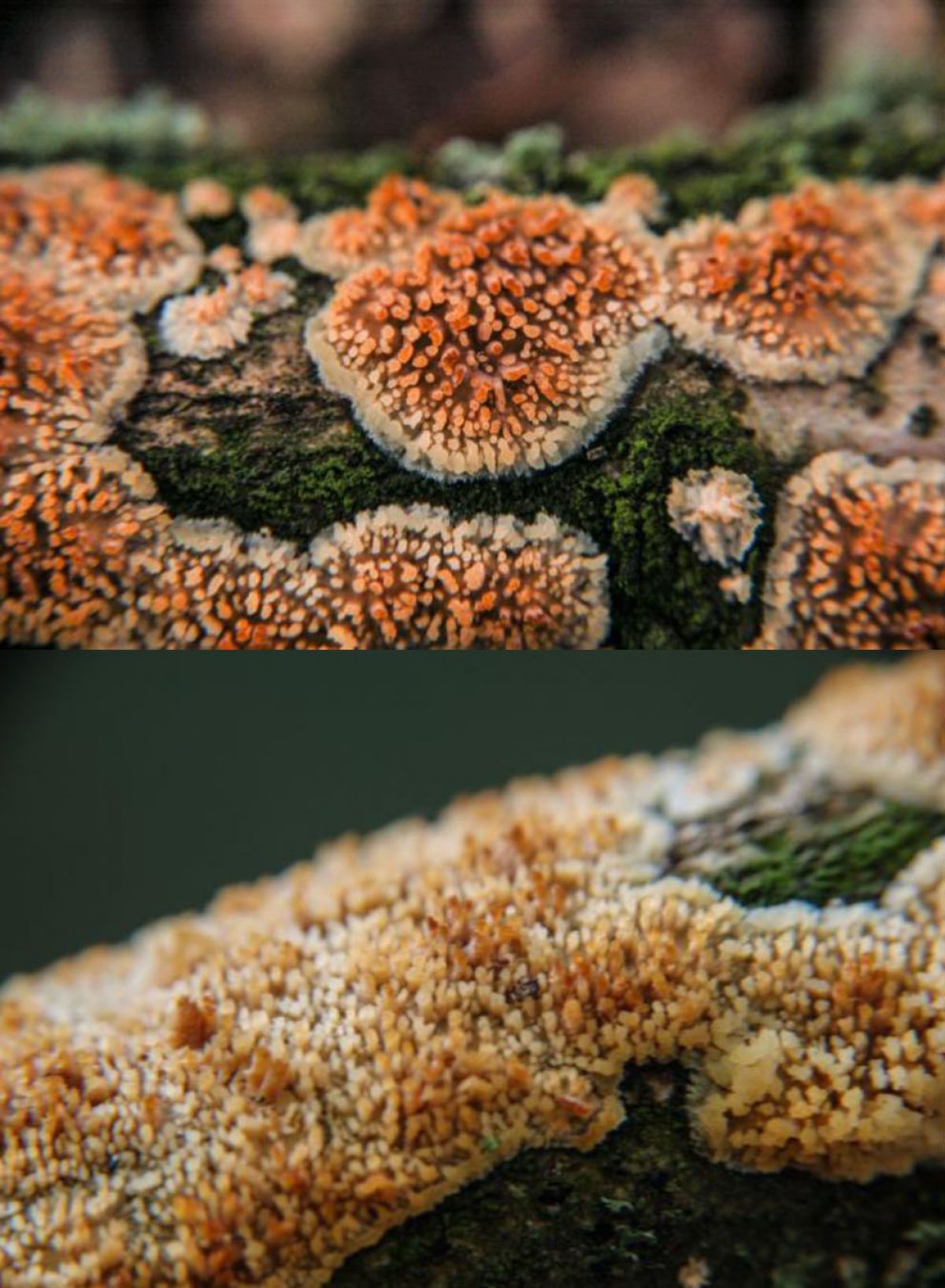Aderzwam of is het een korstzwam? Foto boven is close-up foto en dan zie je de prachtige roest/rode kleur.
