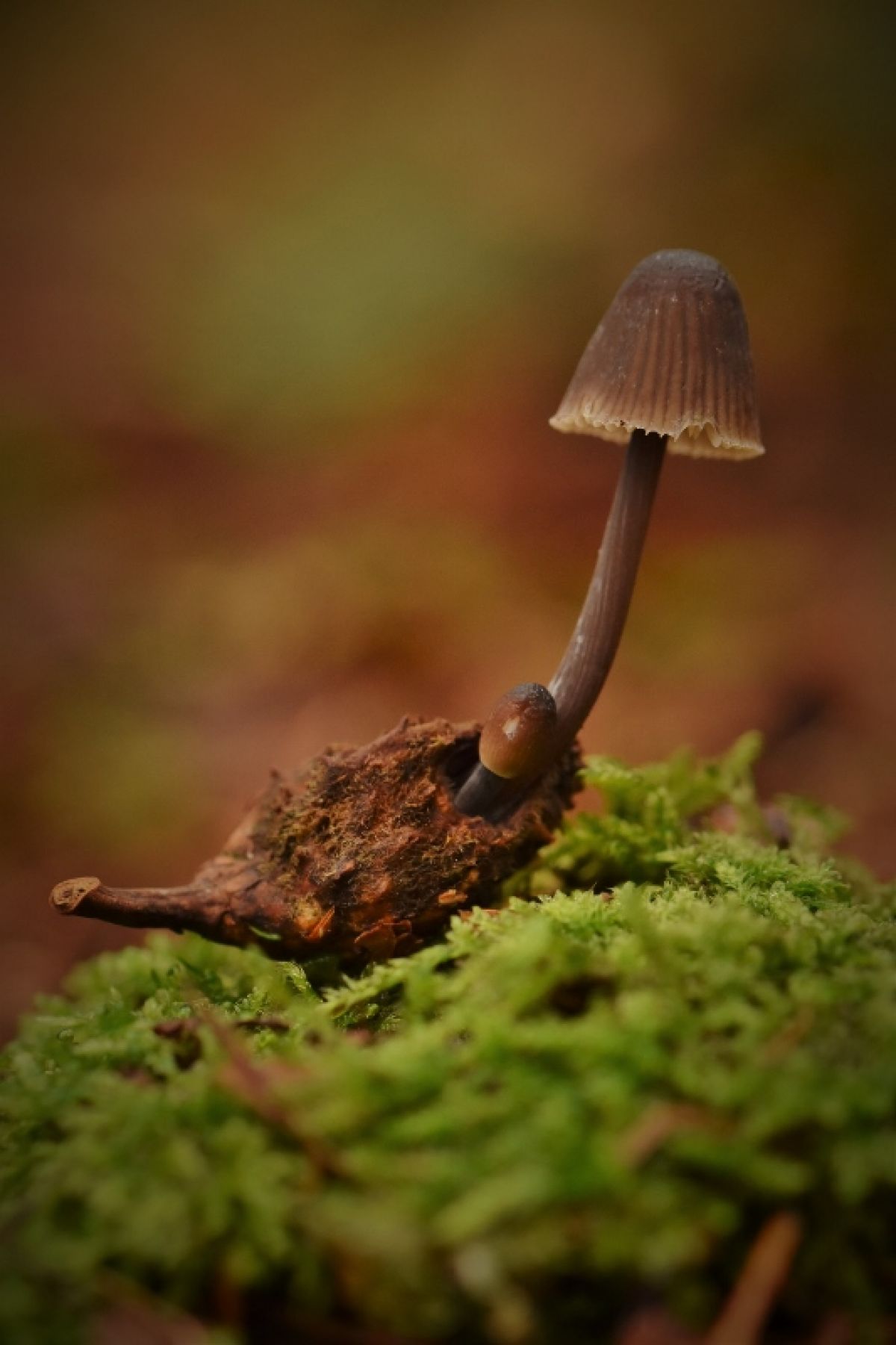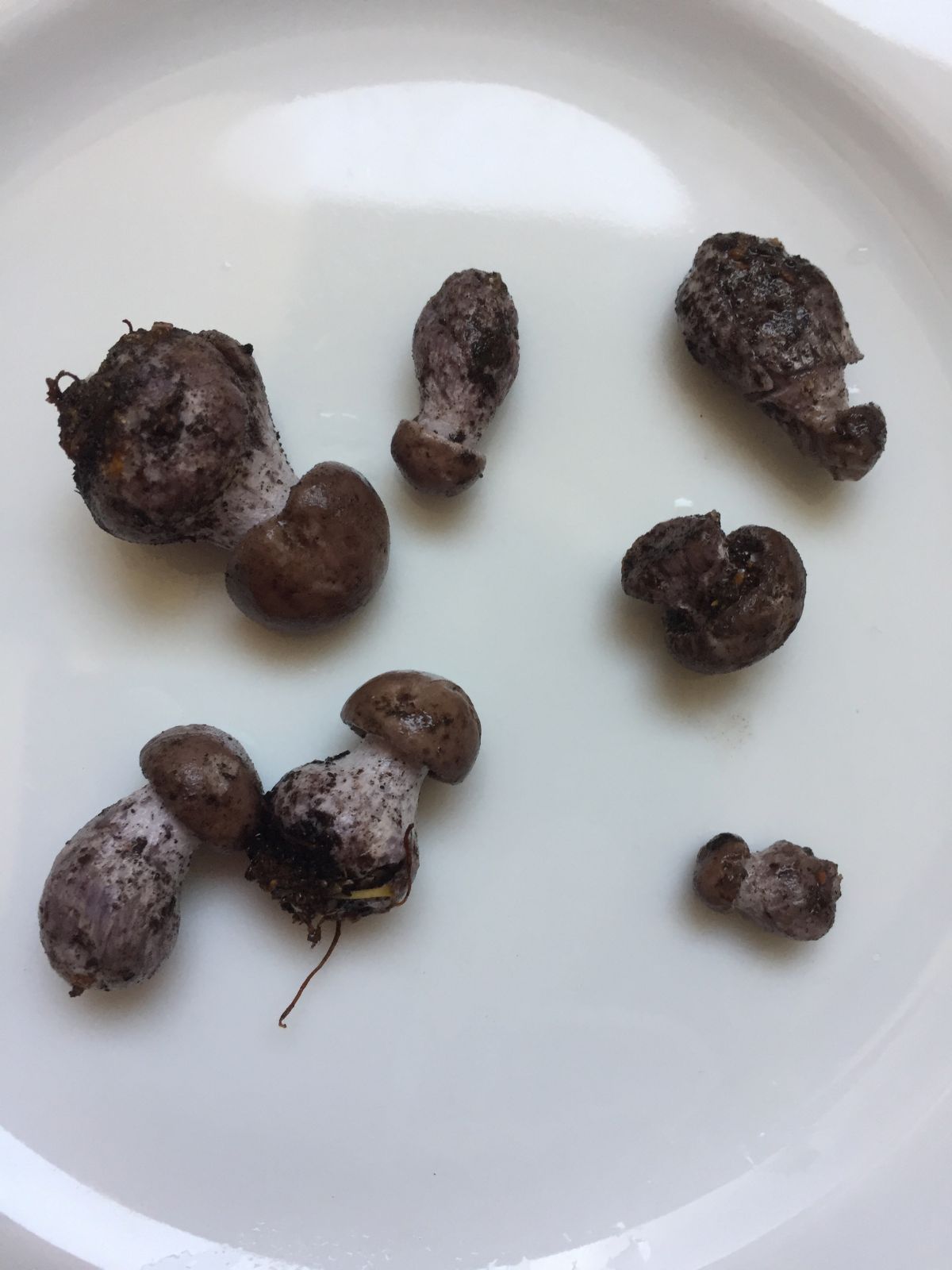 In een losse humuslaag van afgevallen coniferen'veren' vond ik deze kleine, beetje paarsige paddestoeltjes. Ze hebben geen wortels en zaten ondergronds, los van elkaar.
