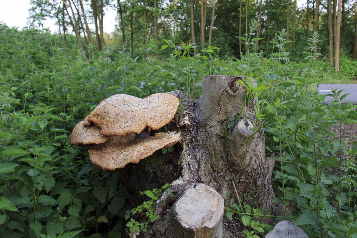 Deze enorme zwam van bijna een halve meter breed, trof ik gister (6 juni) aan op een boomstronk van een-naar ik vermoed-omgezaagde wilg. Ben heel nieuwsgierig naar de soort en vraag me tegelijkertijd af of dit normaal is: zwammengroei in de zomer.