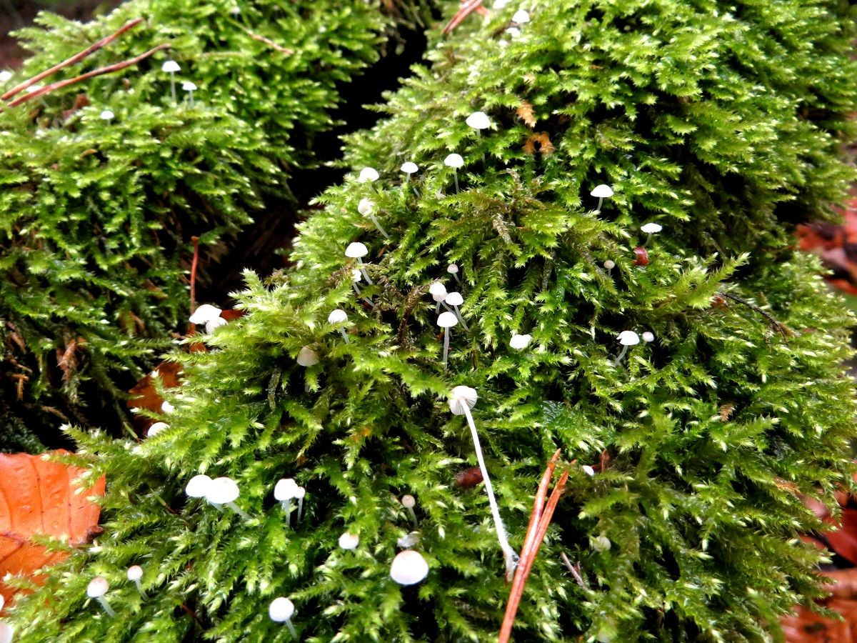 Vandaag in gemengd bos op een stronk van een oude wilg in het mos deze zeer kleine schoonheden. diam. 3-5 mm steellengte c.a. 5 cm met plaatjes die toch wel grof waren.