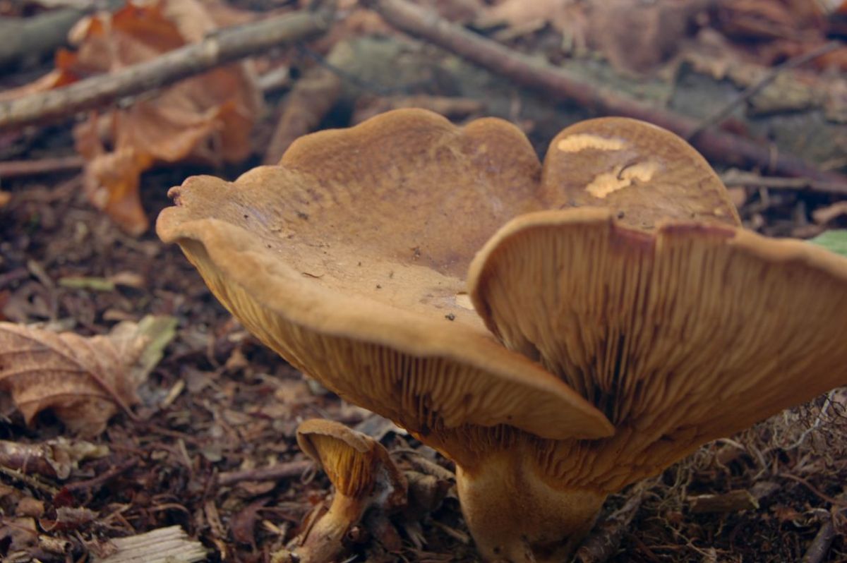 In loofbos, niet op boomstronk. Karamelbruin, 13cm breed.