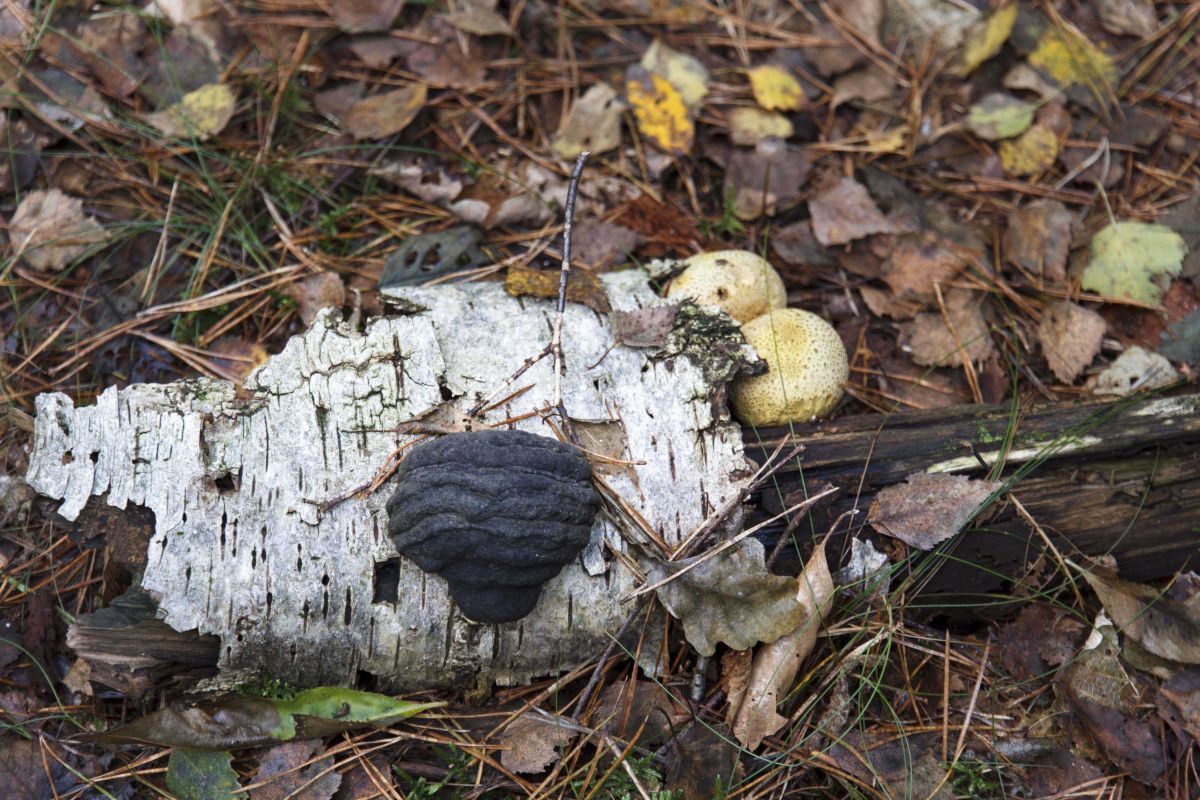 In een bos op de Utrechtse Heuvelrug vond ik dit restant van een berk met daarbij 2 aardappelbovisten (denk ik) en deze zwarte zwam. Wat is daarvan de naam?