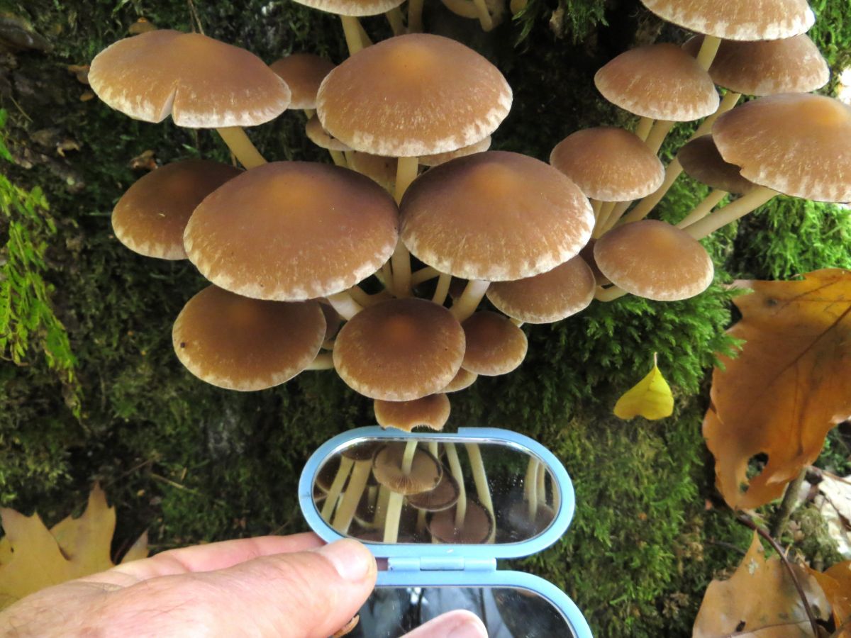 Ik dacht zaterdag een gordijnzwam te zien op een oude am. eik, maar als ik alles vergelijk zou het de Slijmerige blekerik kunnen zijn, witte steel, vleeskleurig naar de rand witter, oud velum onder de rand.