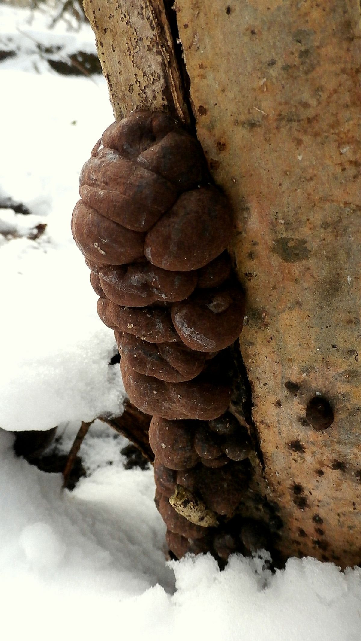 Deze vreemd gevormde, donkerbruin gekleurde zwammen kwam ik tegen op een afgezaagde boomstam.