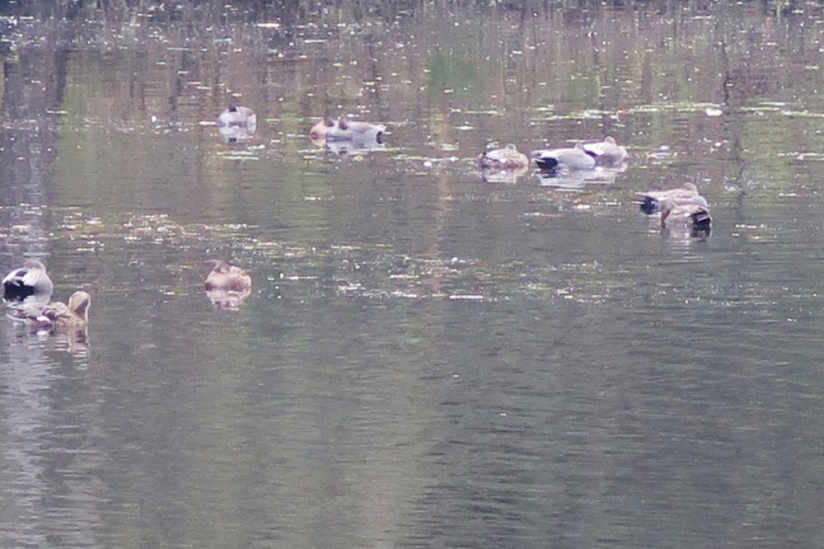 een groep van ongeveer 20 eenden, met zwarte kontjes. Helaas kon ik ze niet dichterbij krijgen met de camera. Kunnen dit krakeenden zijn?
