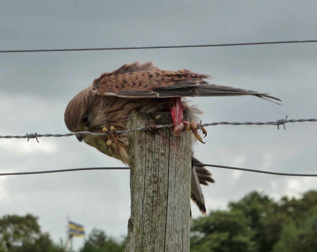 Enkele weken geleden (eind juli) op Ameland zag ik in een wei twee torenvalken boven op elkaar zitten op een paaltje. Bij nadering bleek de onderste valk met zijn poot verstrikt geraakt te zijn in het prikkeldraad. De bovenste valk was bezig de open wond verder aan te pikken. Even later kwam er nog ...