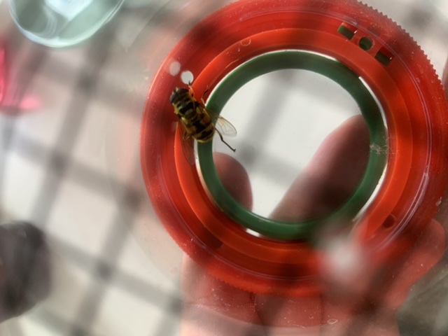 Deze vloog net naar binnen en vermoeden een blinde vlieg. Zo’n 1,5 cm lang. Maakt veel geluid en klapt best hard tegen het glas op. Trekt zijn pootjes op tijdens het vliegen.