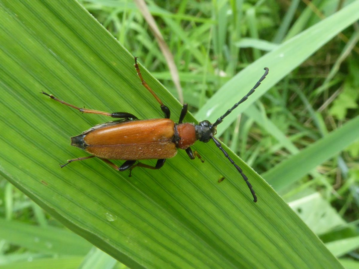 ik kom er niet helemaal uit: met "boktorren determineren" (Nederlands soortenregister) kom ik uit bij bloedrode smalboktor (vrouwtje?), maar mijn exemplaar heeft het tweede segment (waaraan de voorste poten zitten) dezelfde kleur als het achterlijf; op het plaatje van het soortenregister is dat tweede segment zwart (misschien toch de gewone smalboktor?)