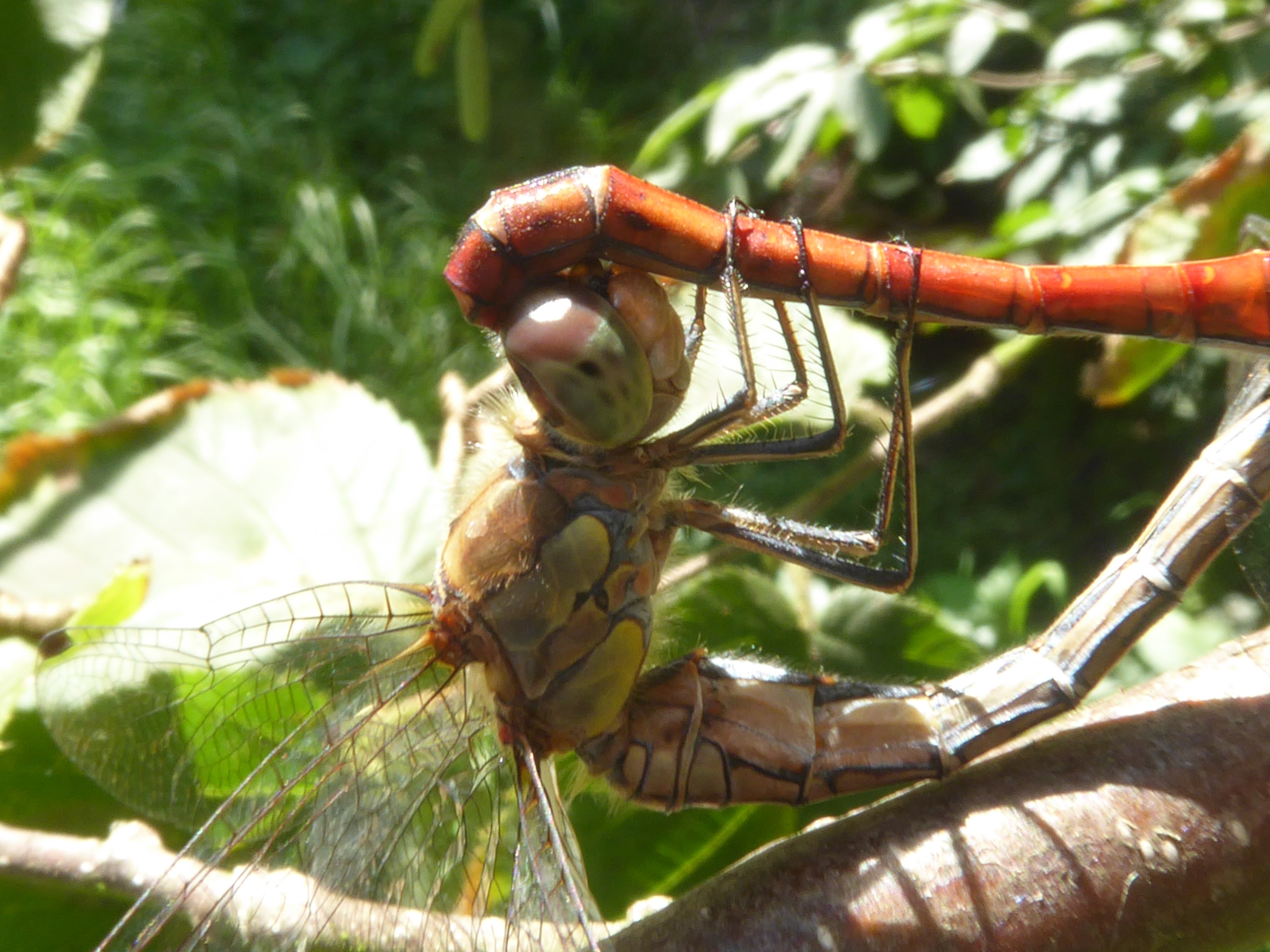 Vanmiddag gezien bij geluidswal met diverse boomsoorten (els, wilg) en veel braam en brandnetel. Het vrouwtje heeft gele vlekken op zijden van borststuk en zwarte poten met gele strepen over dijen en schenen;helaas kon ik het mannetje niet van voren op de foto krijgen. [Libellen"vanm Europa"gebruikt; blz. 280/281].