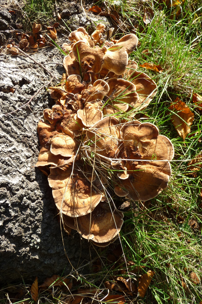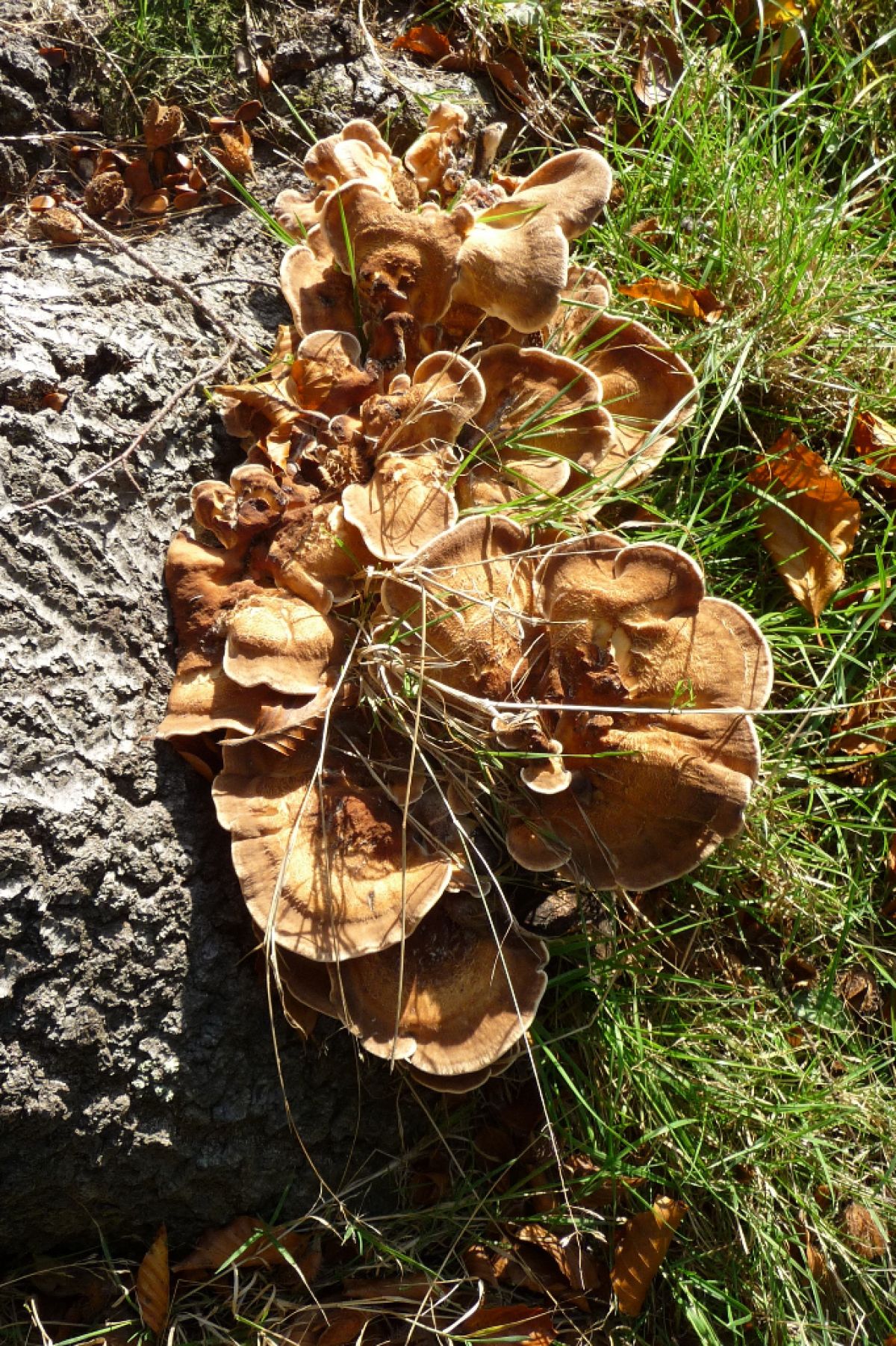 Zeker geen elfenbankje, dat kan ik zo aan de bovenkant wel zien (geen duidelijke ringzones). Wat is het dan wel? Bij houtzwammen is het nog belangrijker dan bij paddenstoelen op een steel om de onderkant te zien. Dus om een indicatie te krijgen zou ik die moeten zien. Het zou een reuzenzwam kunnen zijn, maar ik twijfel daar aan.