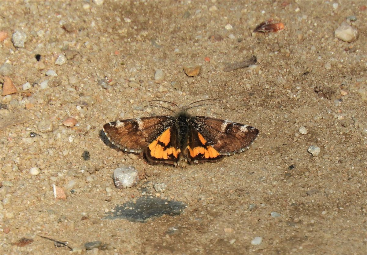 Ik heb een paar vlinderboekjes door gekeken maar ik kon de naam niet vinden van dit kleine vlindertje. Ik dacht eerst een Bosrankvlinder, maar die heeft weinig oranje zo te zien. Ik kwam hem tegen in de bossen en was iets groter dan een kommavlindertje.