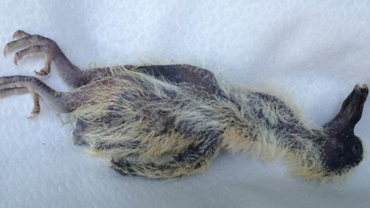 Het is een vormeloos hoopje maar het kopje en de snavel zijn duidelijk herkenbaar als een jong houtduifje.