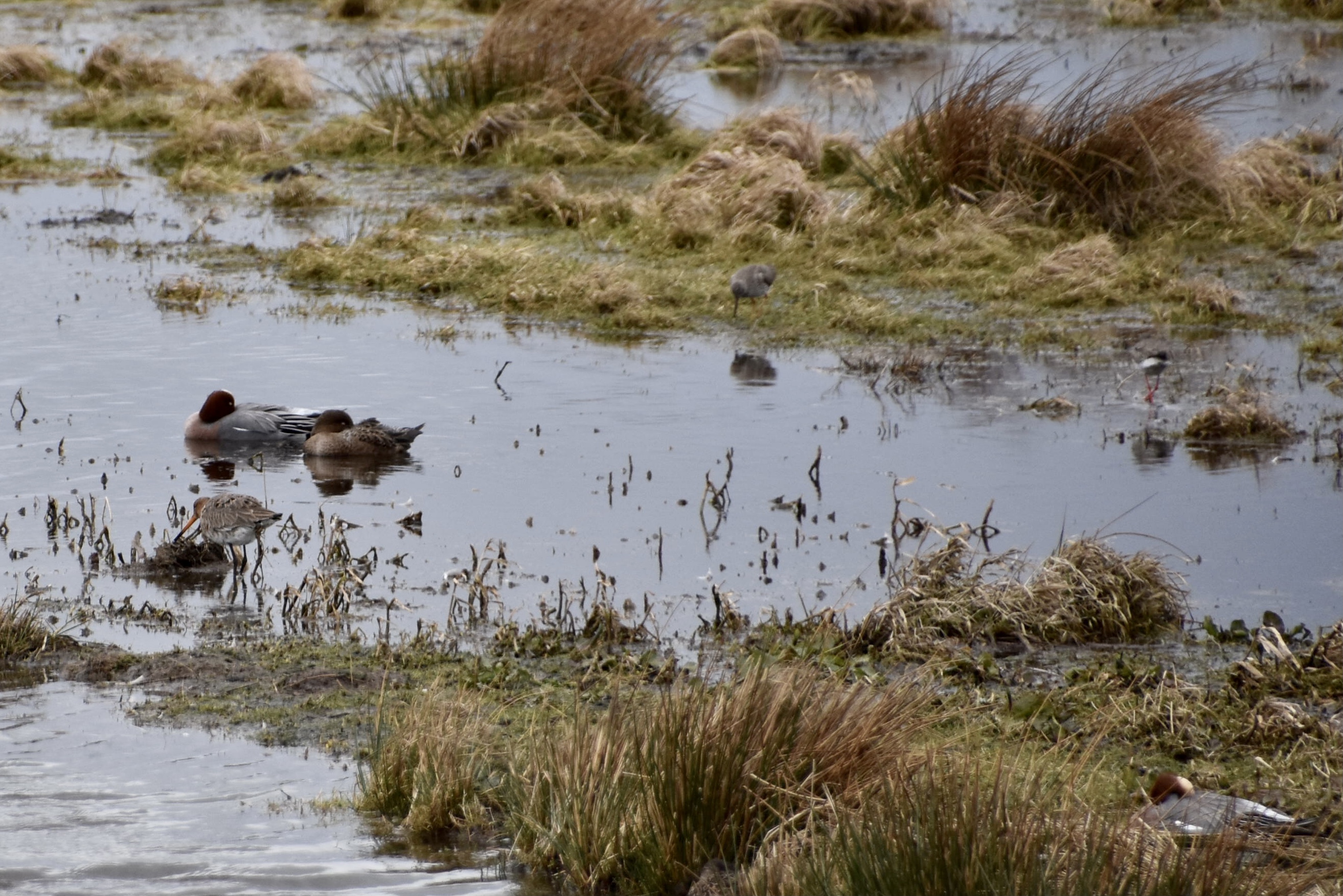 Op de foto slapende smienten, een grutto, bovenin de kant een tureluur, maar de vliegende vogel herken ik niet, een zwarte ruiter misschien??