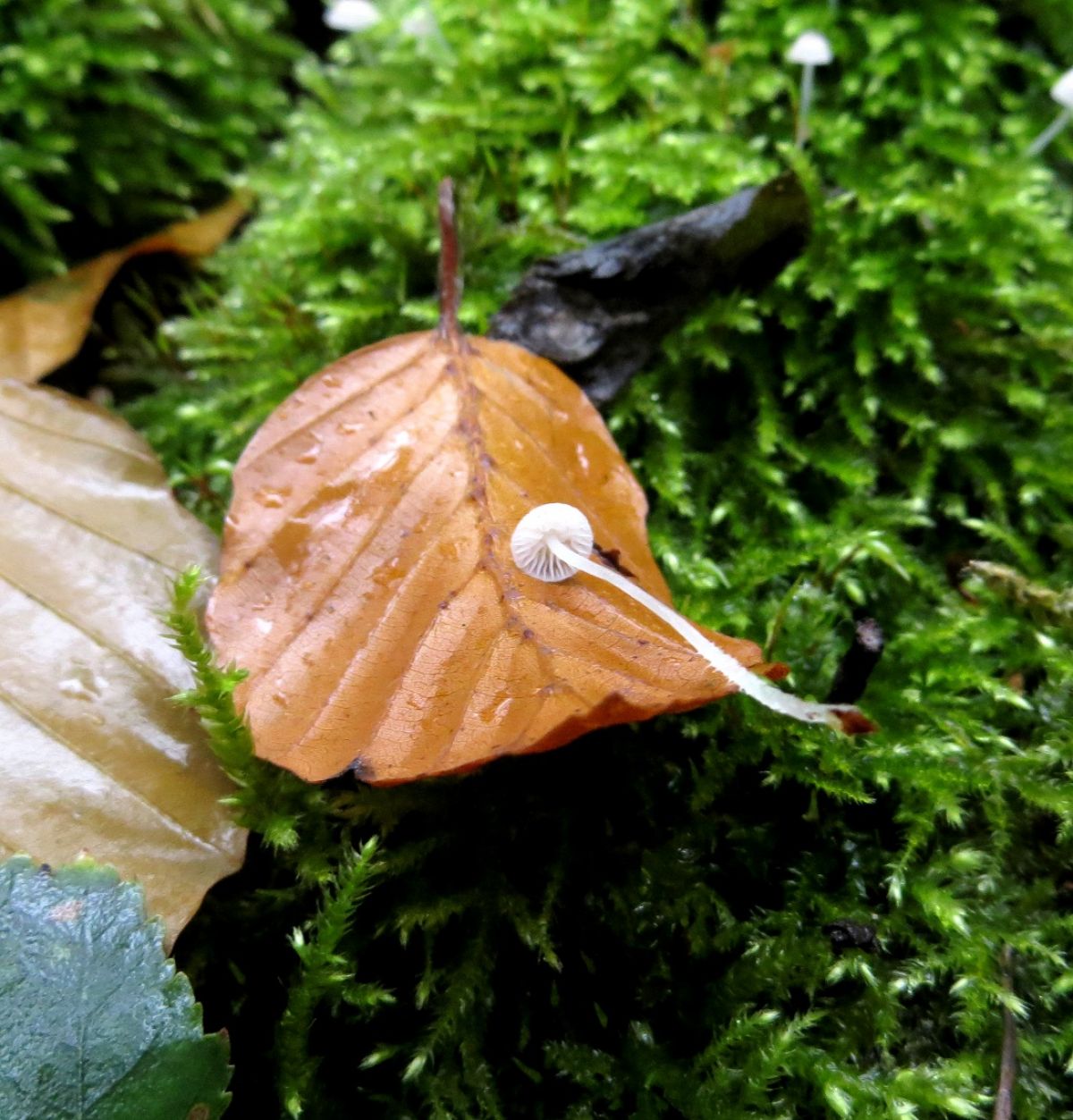 Vandaag in gemengd bos op een stronk van een oude wilg in het mos deze zeer kleine schoonheden. diam. 3-5 mm steellengte c.a. 5 cm met plaatjes die toch wel grof waren.