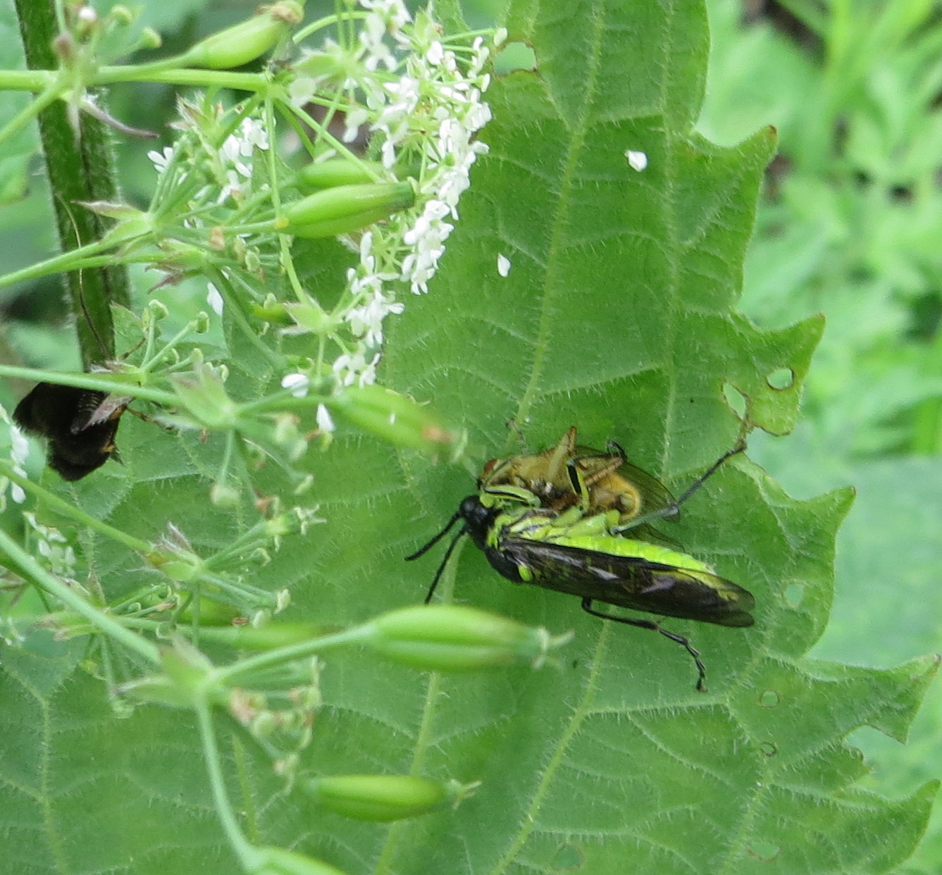 Ik zag vanmiddag op een brandnetelblad op Landgoed Klein Bylaer in Barneveld dit heel mooi, groene insect zijn prooi bespringen en uitzuigen in de nek van de prooi ( strontvlieg??)