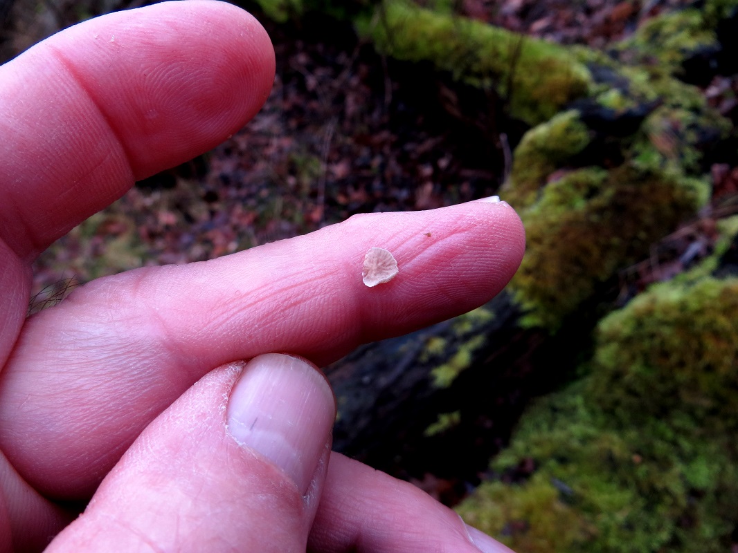 op 24 febr. gevonden in een bosrand (zandgrond) tussen het ik dacht gebogen sterrenmos, deze kleine plaatjeszwammen. Ik kan er geen chocolade van maken, wie weet raad ?