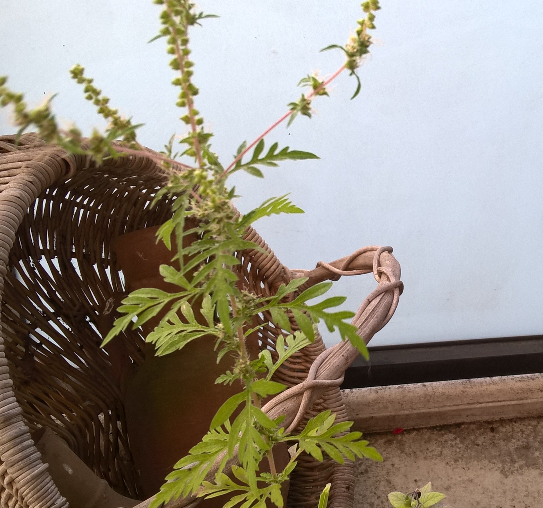 Dat is Alsemambrosia (Ambrosia artemisiifolia) ; uittrekken en verwijderen. Er wordt zelfs aanbevolen om het niet met blote handen aan te raken....Sterk allergene plant. Waarschijnlijk opgeschoten uit vogelzaad.....