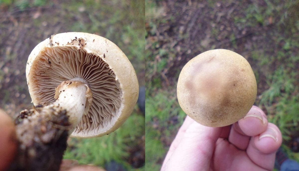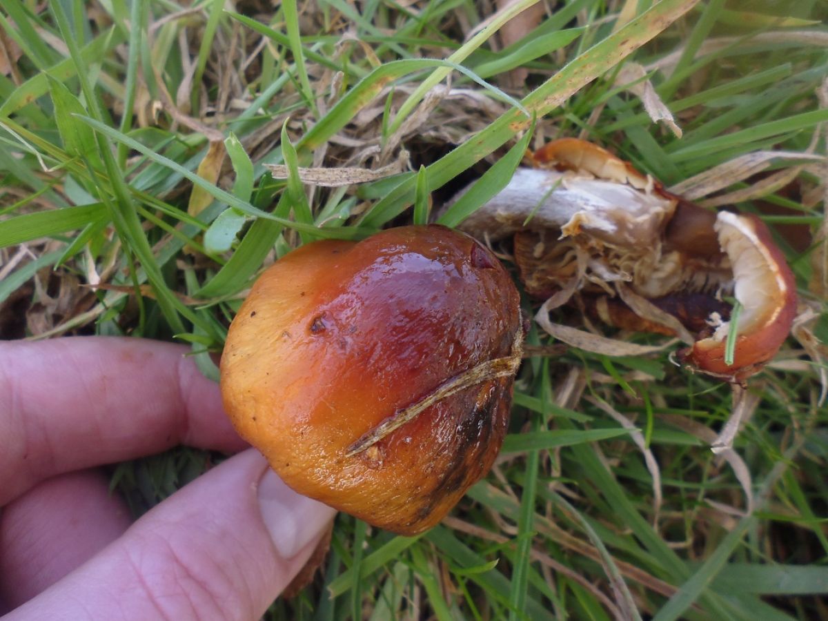 Tja - in dit stadium is het erg lastig om een paddenstoel op naam te krijgen. Ik zie restanten van een ring helemaal boven aan de steel. Samen met de tweede foto (bruine glanzende hoed) kom ik dan tot een gok: een leverkleurige leemhoed.