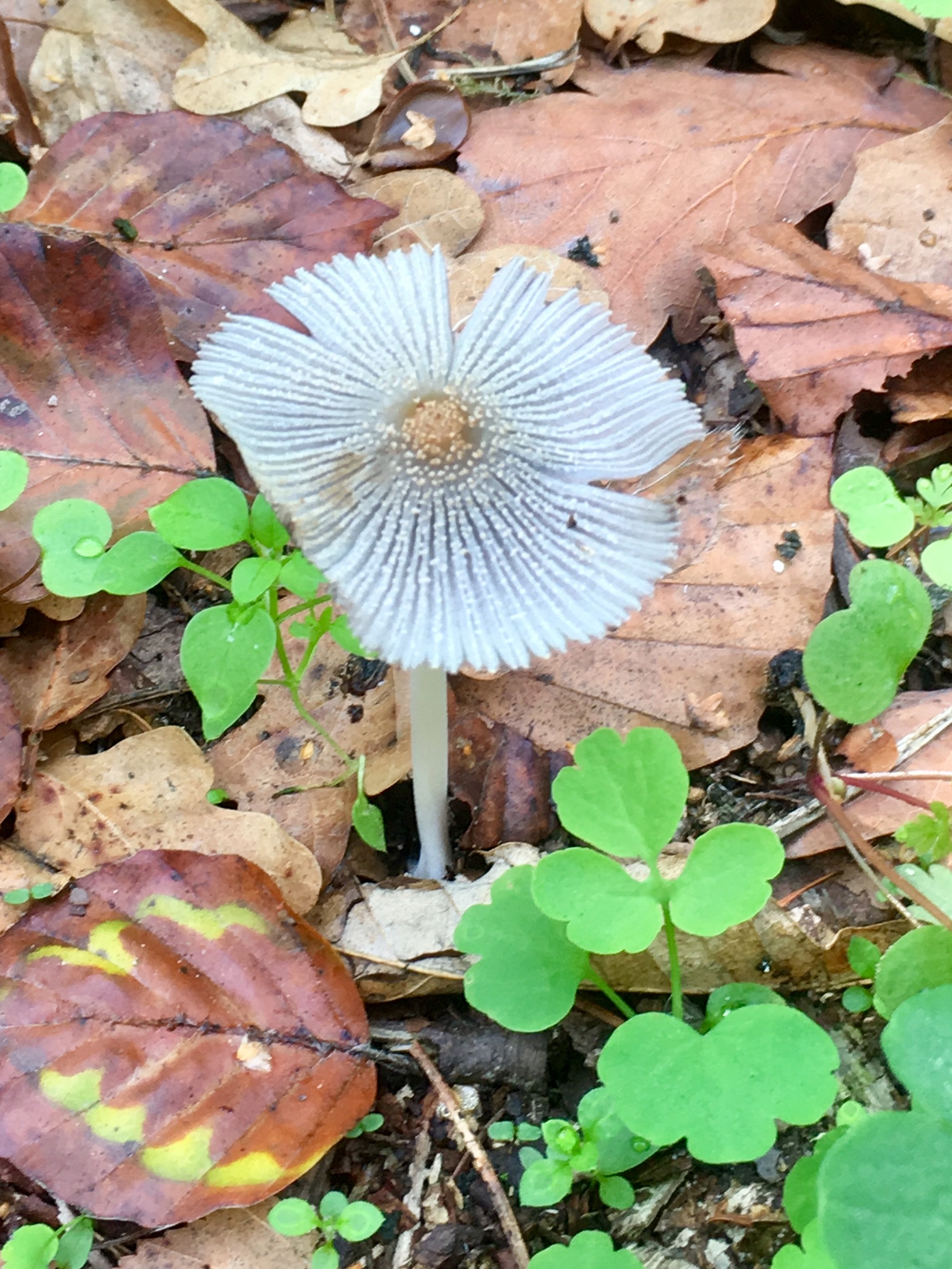 Ik heb een foto gemaakt van een paddenstoel waarvan de bovenkant omgekeerd lijkt te zijn, je ziet de strepen van het zaad aan de bovenkant.