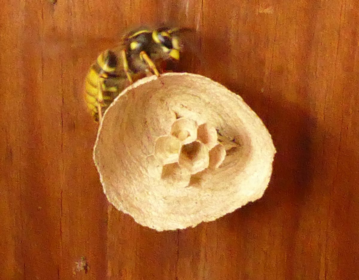 Vanmiddag vloog, toen ik de schuur inliep, een wesp naar binnen. Nieuwsgierig keek ik, waar het beestje heen vloog. Aan het plafond hing een wespennest in wording waaraan het insect verder ging werken.